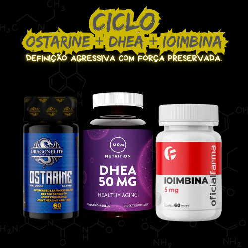 1 cápsula de Ostarine (10 mg), 1 cápsula de DHEA (25 mg), 1 cápsula de Ioimbina (10 mg) ao dia, preferencialmente em jejum.