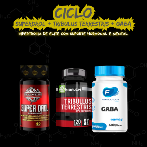 1 cápsula de Superdrol (20 mg), 1 cápsula de Tribulus (500 mg), 1 cápsula de GABA à noite.