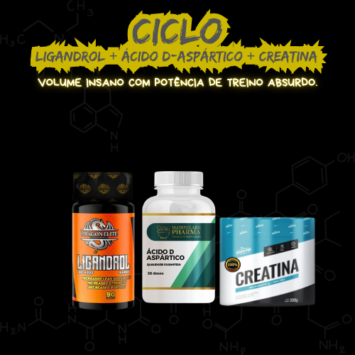 1 cápsula de LGD-4033 (10 mg), 1 dose de ácido D-aspártico (3g), 1 dose de creatina (5g) por dia.